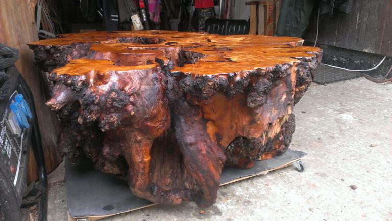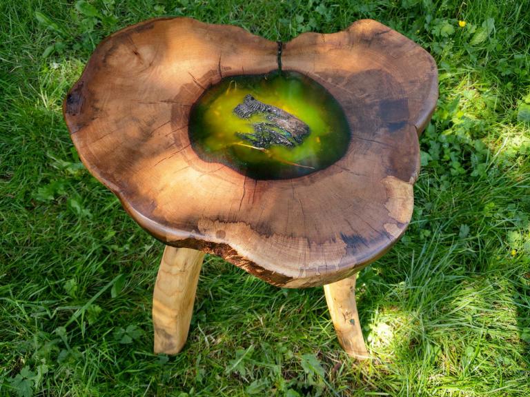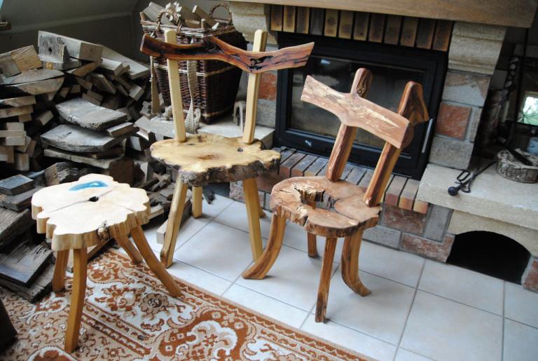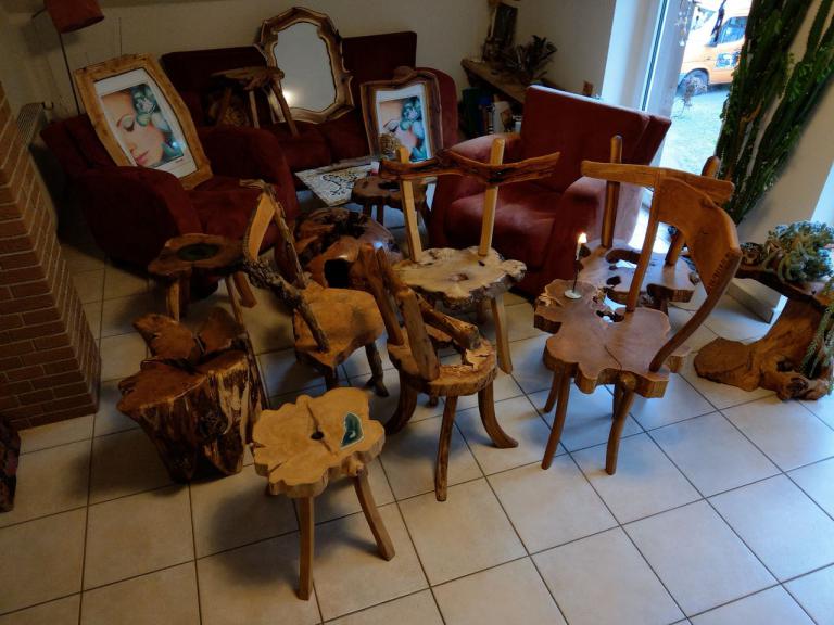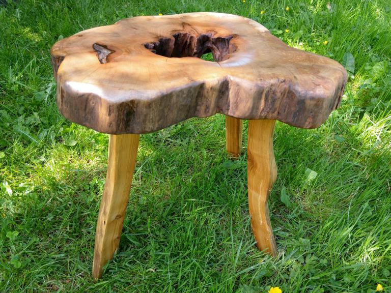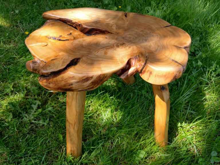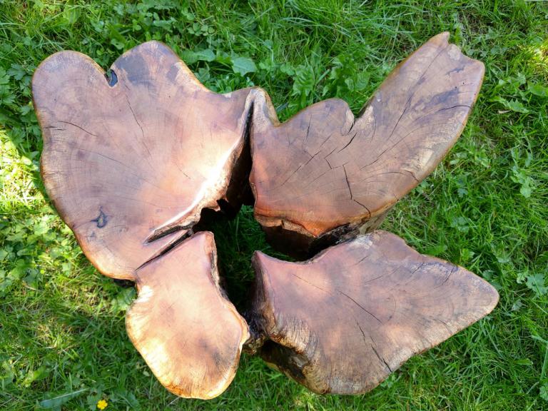 Gemütliche Hocker aus besonders schönen Hirnholzscheiben verschiedener Baumarten – Robinie, Birne, Ulme, Kirschwurzel - …oder massiv aus der Wurzel einer mächtigen Erle oder dem ausgehölten Stamm einer alten Birne.