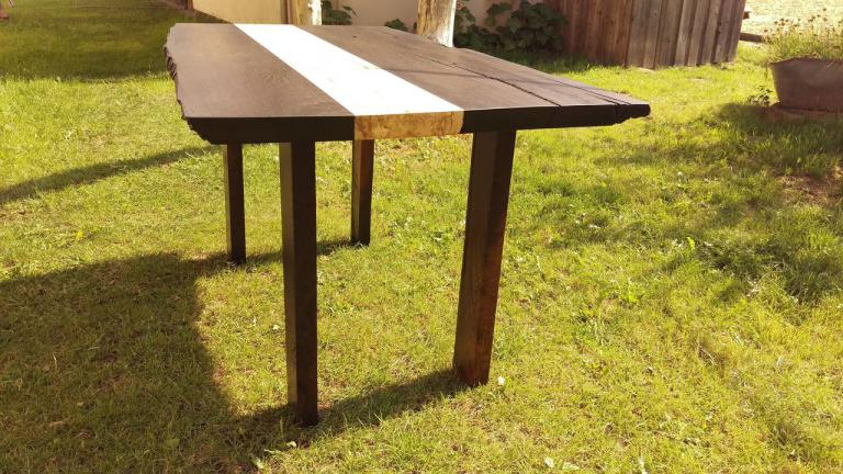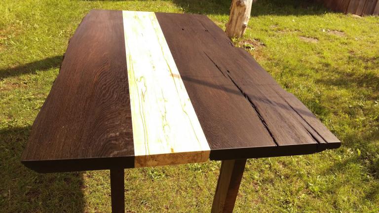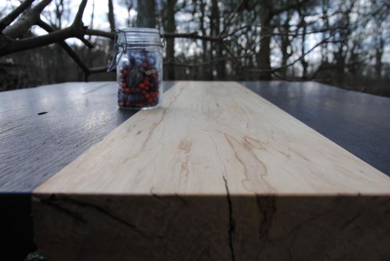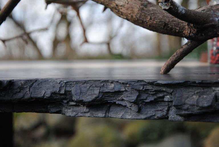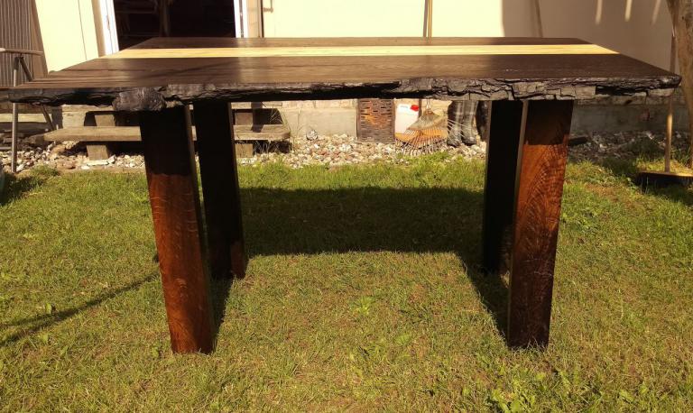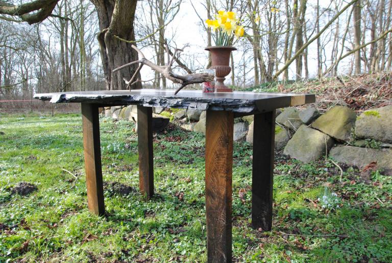 Esstisch aus echter Mooreiche aus dem Jahr 971 vor Christus (exaktes Alter durch dendrochronologisches Gutachten nachgewiesen). Mittelstück aus Pappel.
