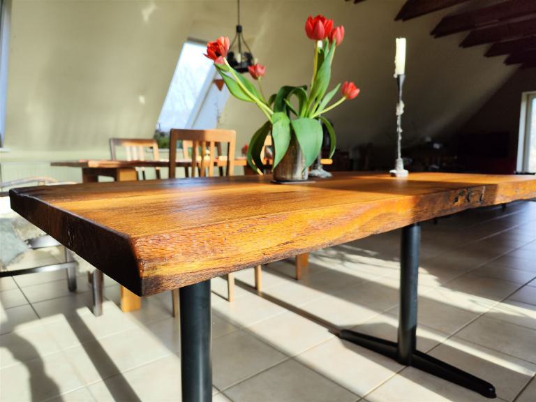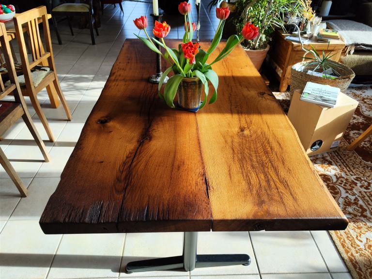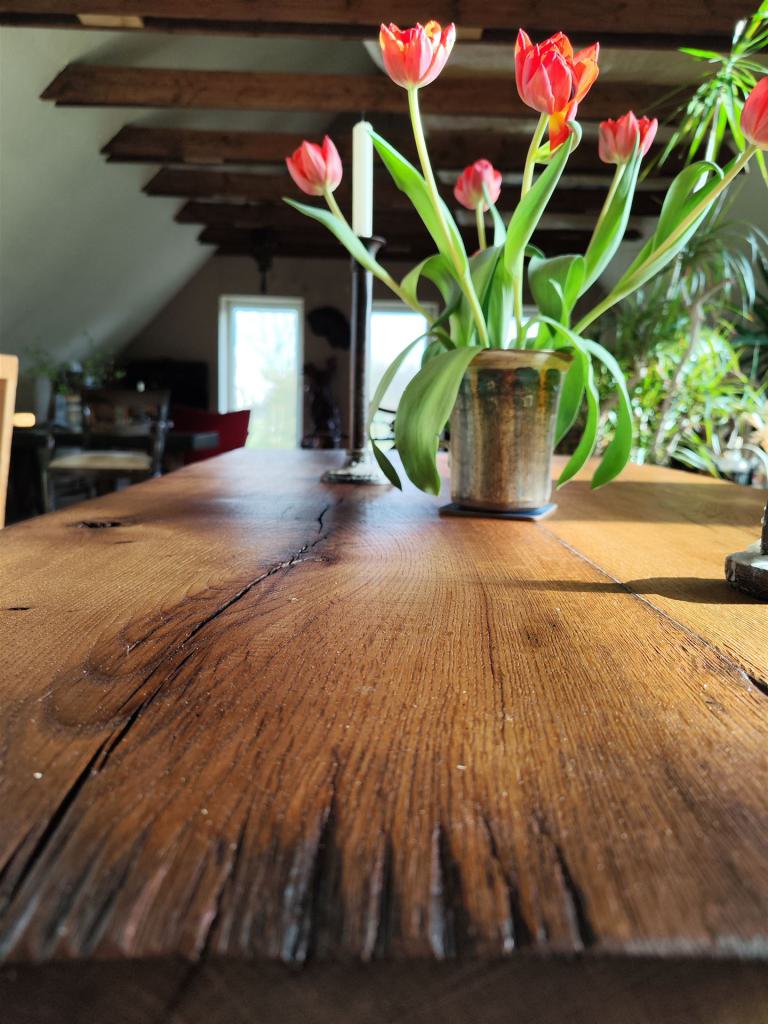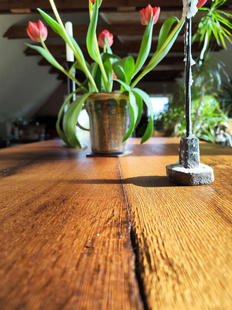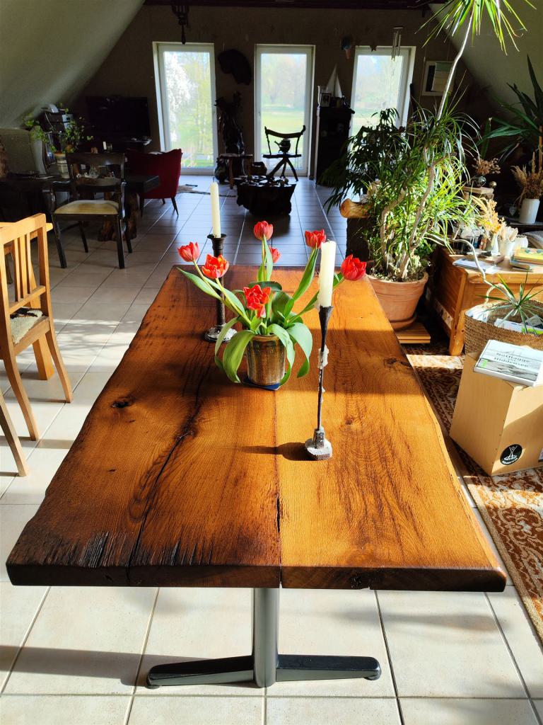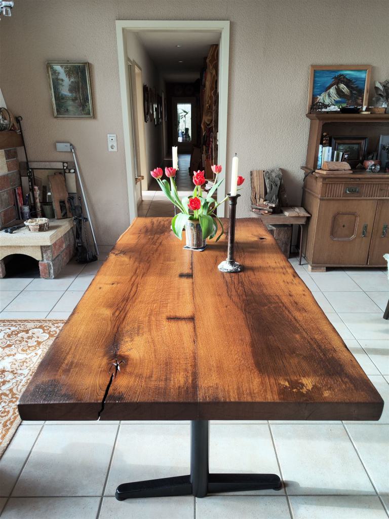 Diese Tischplatte ist aus zwei Eichen-Kaminbohlen eines alten Fachwerkhauses, datiert auf das Jahr 1731, gefertigt. Die Eiche war ca 200 Jahre alt, bevor sie im Winter 1730/31 gefällt und über der offenen Herdstelle verbaut wurde. Leider war diese Herdstelle nicht mehr intakt und die Bohlen mussten einem Umbau weichen.