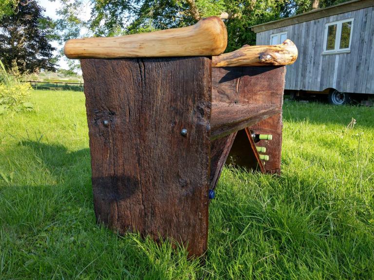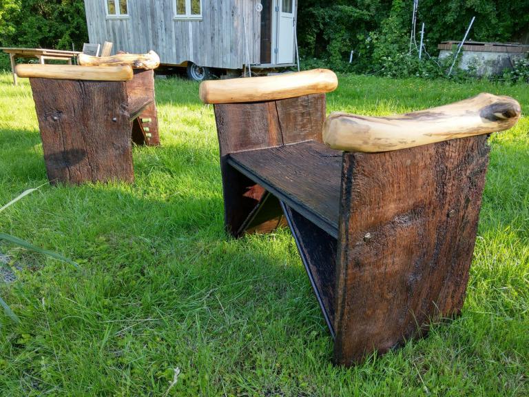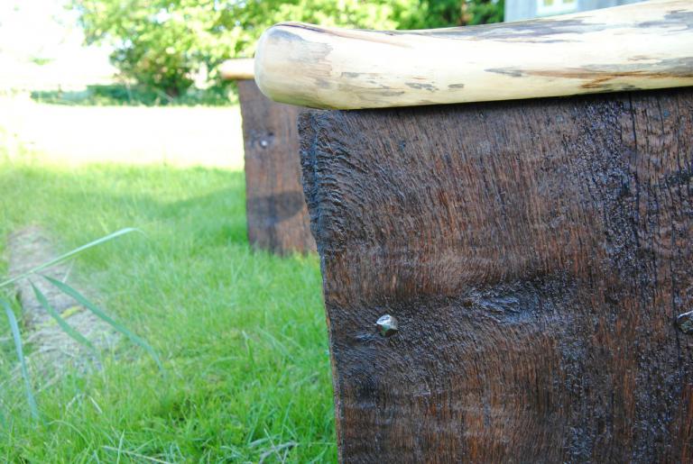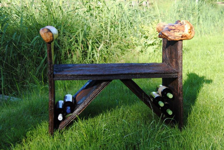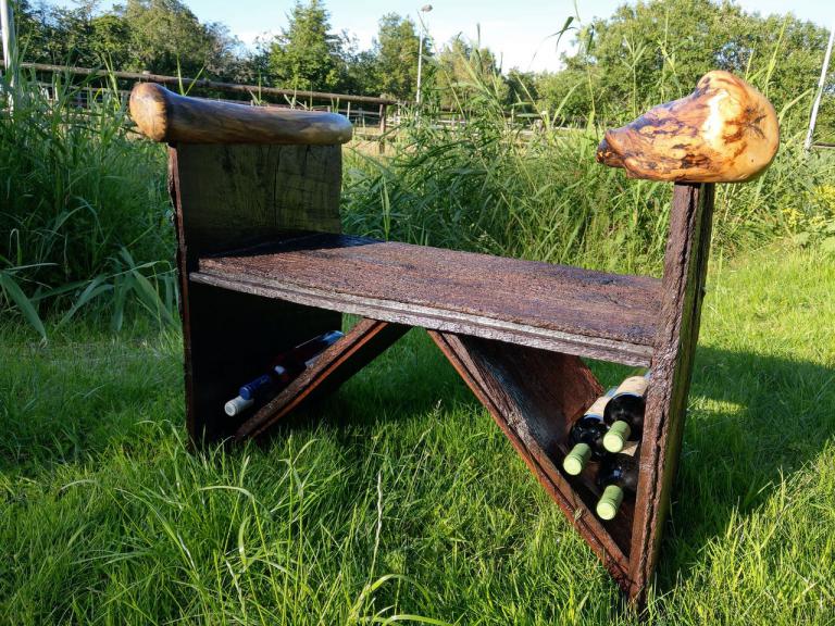 Großzügige Weinbank aus alten Eichendielen eines Bützower Bürgerhauses von 1707, welche nur gebürstet diesen einzigartigen alten Charakter behielten. Die Armlehnen sind aus den Ästen einer mächtigen über 100 Jahre alten Duvendieker Ulme, welche ein Sturm vor ein paar Jahren zu Fall brachte.