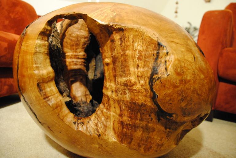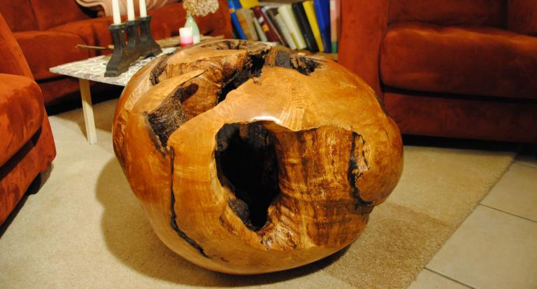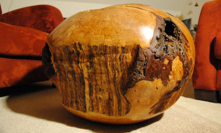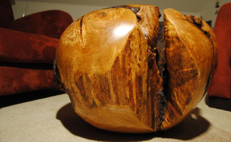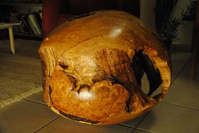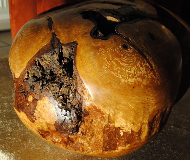 Diese „Kugel“ (sie ist nicht wirklich rund) habe ich aus dem Wurzel-Stammansatz einer alten Duvendieker Erle herausgearbeitet. Durch die Oberflächenpolitur zeigt sich die Wurzelmaserung in warmen Gelb-und Rottönen.