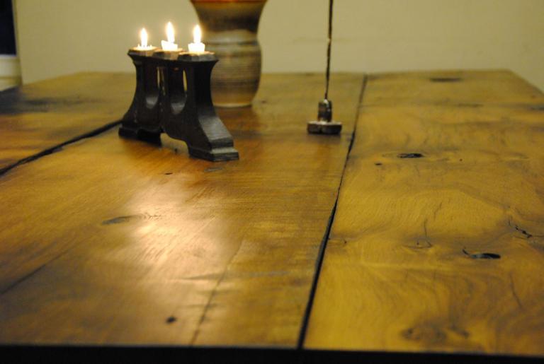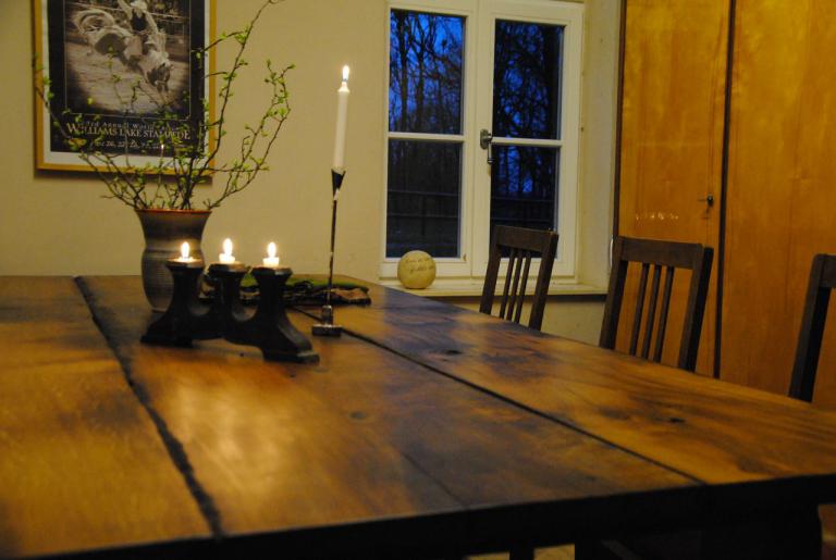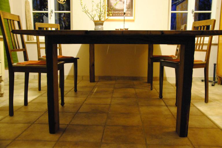 The frame and the legs are made from the roof beams of the smoke kitchen in the same building.