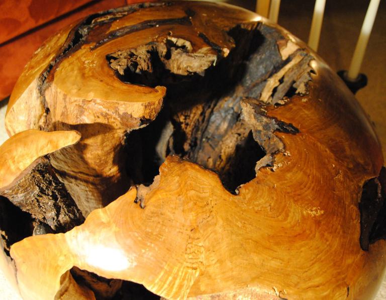 Esta "bola" (no es realmente redonda) la he elaborado a partir del tronco de la raíz de un viejo aliso Duvendieker. A través del pulido de la superficie, las vetas de la raíz se muestran en cálidos tonos amarillos y rojos.